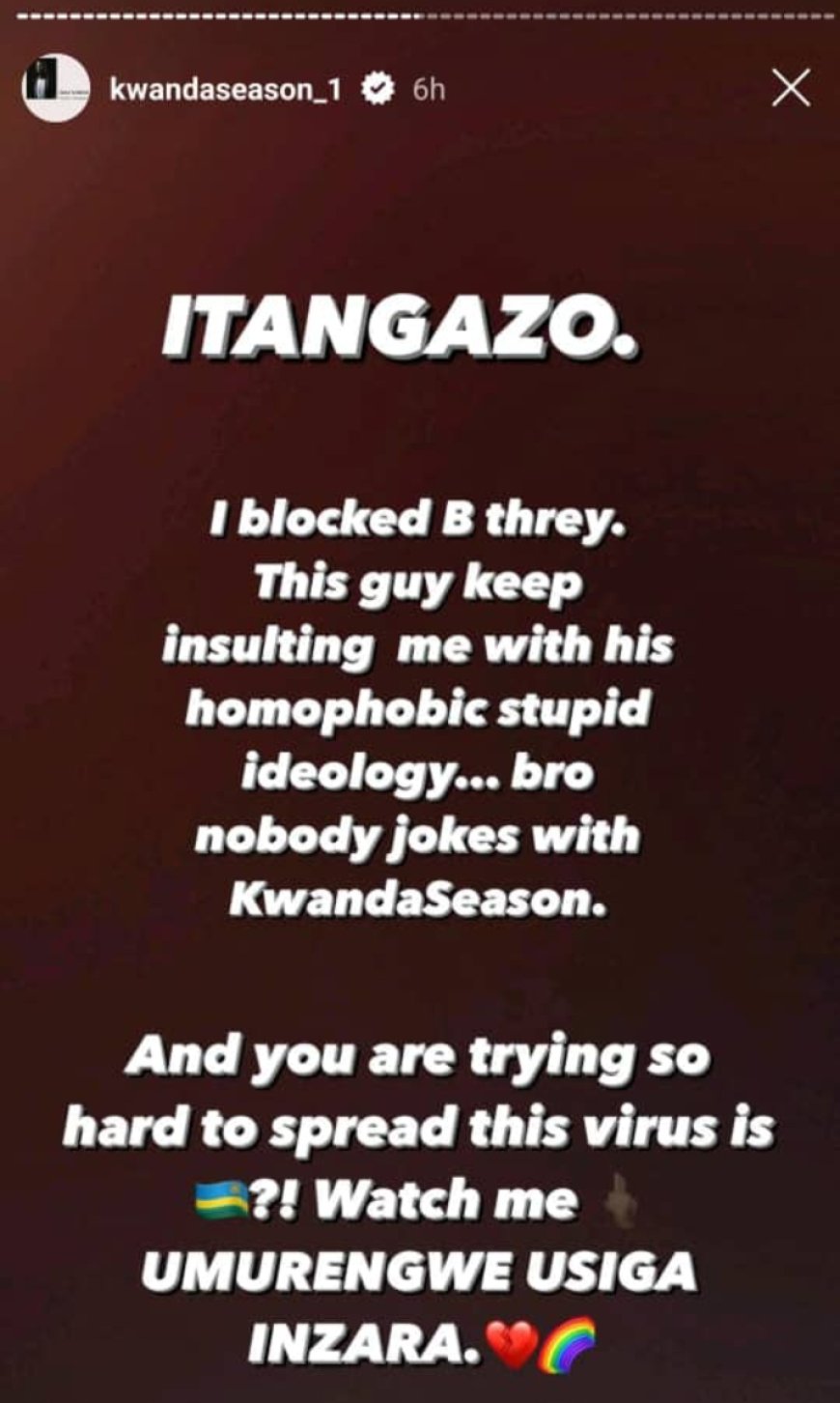 Yagize ati:"Nafunze/ nakomanyirije ku mbuga nkoranyambaga (bivuze ko yahagaritse kuba B Threy yamwohereza ubutumwa cyangwa ngo bagiranye ibiganiro), uyu B Threy yakomeje kuntuka akoresheje ubugoryi bwe bw'ingengabitekerezo yo kurwanya abatinganyi... Muvandi, nta muntu ukina n'igihembwe cyo Kwanda (Kwanda Season). Kandi uri kugerageza gukwirakwiza iyi virusi mu Rwanda."