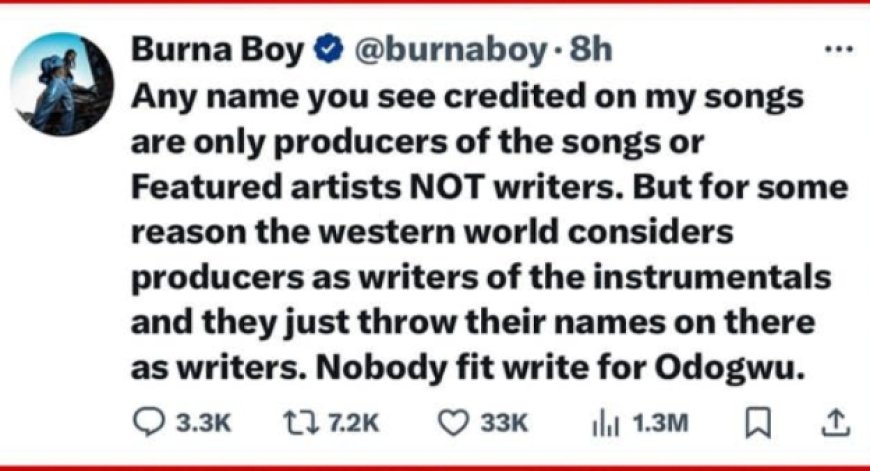 Umuhanzi Burna Boy wamenyekanye mu ndirimbo zirimo On the Low, For my Hand na Last Last yaciye ku mbuga nkoranyambaga ahishurira abazikoresha ko nta muntu wamwandikira indirimbo akayiririmba mu cyimbo ke.