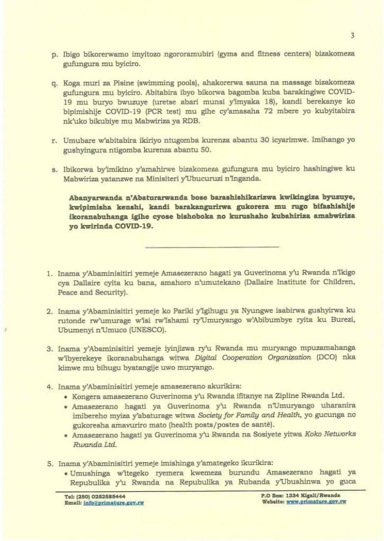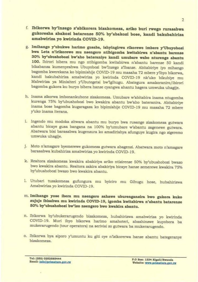 Ibikorwa by’inzego z’abikorera byo bizakomeza ariko buri rwego rurasabwa gukoresha abakozi batarenze 50% by’abakozi bose kandi bakubahiriza amabwiriza yo kwirinda Covid-19.