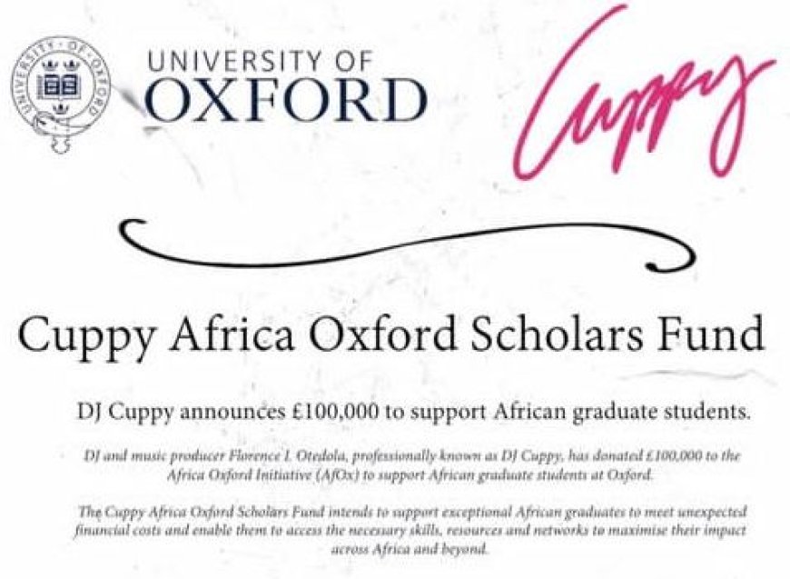 Umunyanigeriakazi witwa Florence Ifeoluwa Otedola akaba azwi ku izina rya Dj Cuppy mu mwuga wo kuvanga indirimbo. Yatangaje ko agiye gutanga imfashanyo ku banyeshuri b' Abanyafurika basoje amasomo yabo muri Kaminuza ya Oxford. Akaba yaboneyeho umwanya wo gutangaza aya ariyo n'impamvu igiye gutuma ayabaha.