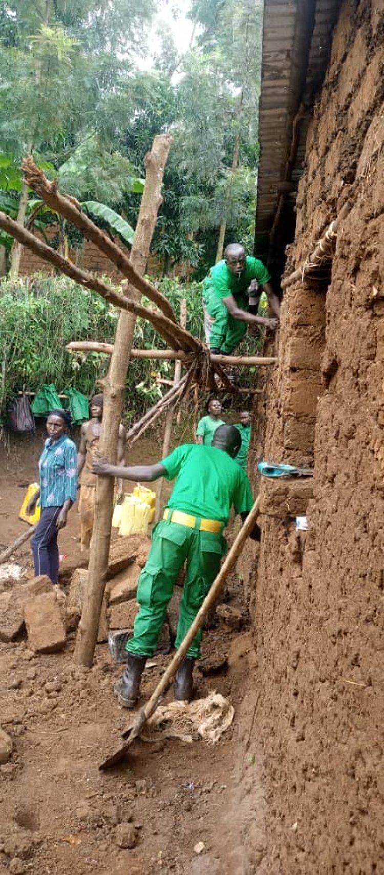 Abayobozi batandukanye bafatanyije n'urwego rwa DASSO bubakiye umuturage wasenyewe n'ibiza wo mu mudugudu wa Murehe, Akagari ka Akamatamu mu murenge wa Jabana.