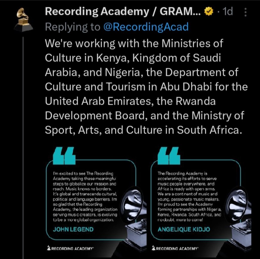 Yagize ati:"Umuryango 'The Recording Academy' ukomeje kwagura amaboko hirya no hino ku Isi mu gufasha abanyamuziki, kandi n'Abanyafurika biteguye kubona ibyiza byayo."