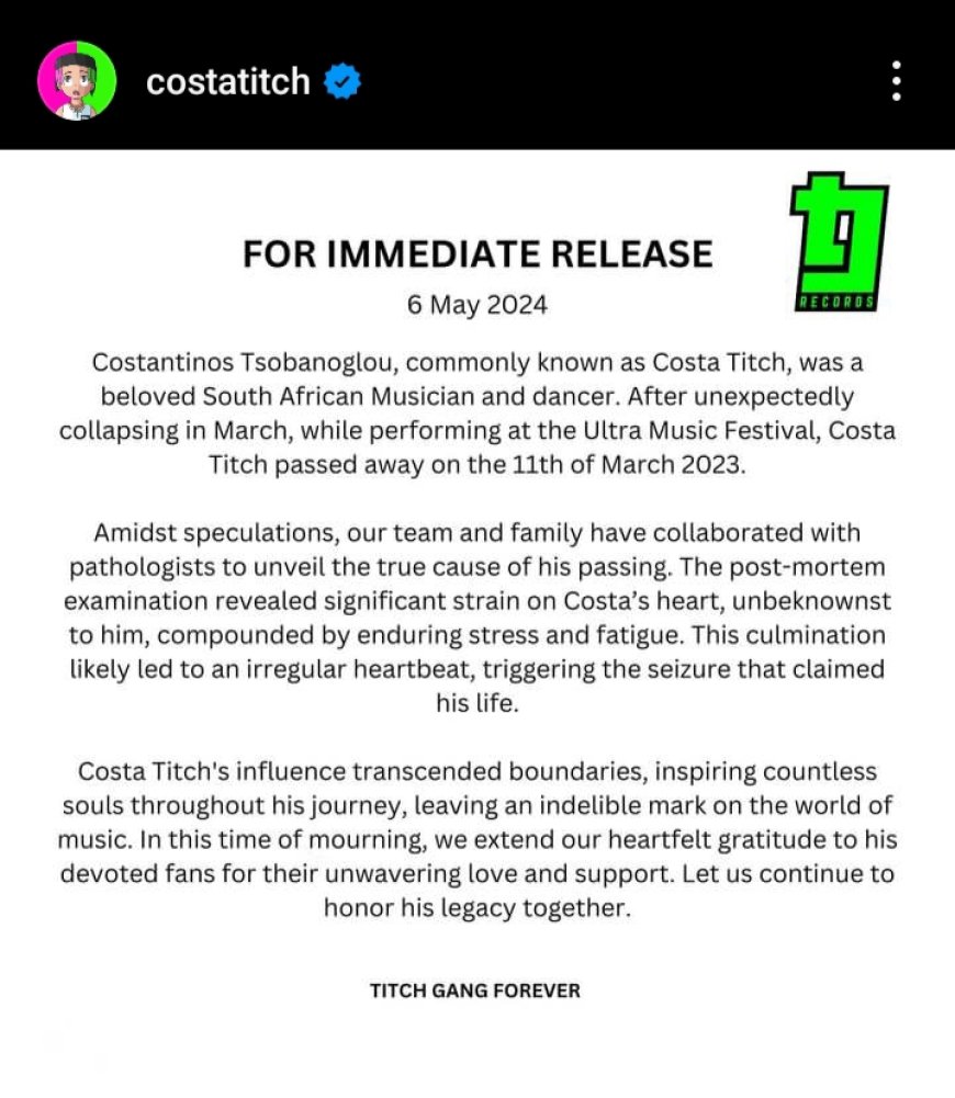 Iyo baruwa igira iti:"Costantinos Tsobanoglou wari uzwi nka Costa Titch, akaba yari umuhanzi n'umubyinnyi w'umuhanga. Nyuma yo guhananuka ku rubyiniro mu buryo butunguranye, igihe yari mu gitaramo cyari kiswe 'Ultra Music Festival' yitaba Imana ku wa 11 Werurwe 2023."