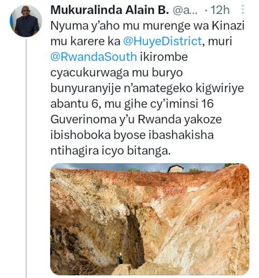 Mu mpera z'ukwezi kwa Mata (4) uyu mwaka hamenyekanye amakuru ko hari abantu batandatu bagwiriwe n'ikirombe cyacukurwaga mu buryo butubahirije amategeko giherereye mu murenge wa Kinazi ho mu karere ka Huye. Guverinoma y' u Rwanda yahise itangiza igikorwa cyo gushakisha abo bagwiriwe na cyo. Nyuma y'iminsi irenga 16, bataraboneka, Leta yafashe umwanzuro wo guhagarika icyo gikorwa kuko bari bamaze kugera muri metero 70 z'ubujyakuzimu.