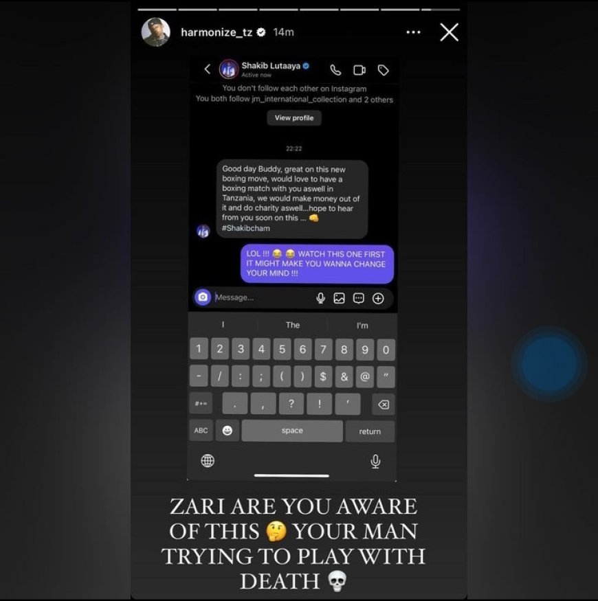 Harmonize ntiyagarukiye aho, kuko yahise asangiza bamukurikira kuri Instagram icyo kiganiro kigufi yagiranye na Shakib, abaza umugore we, Zari, niba ibyo yabimenye ko umugabo we ashaka gukina n'urupfu.