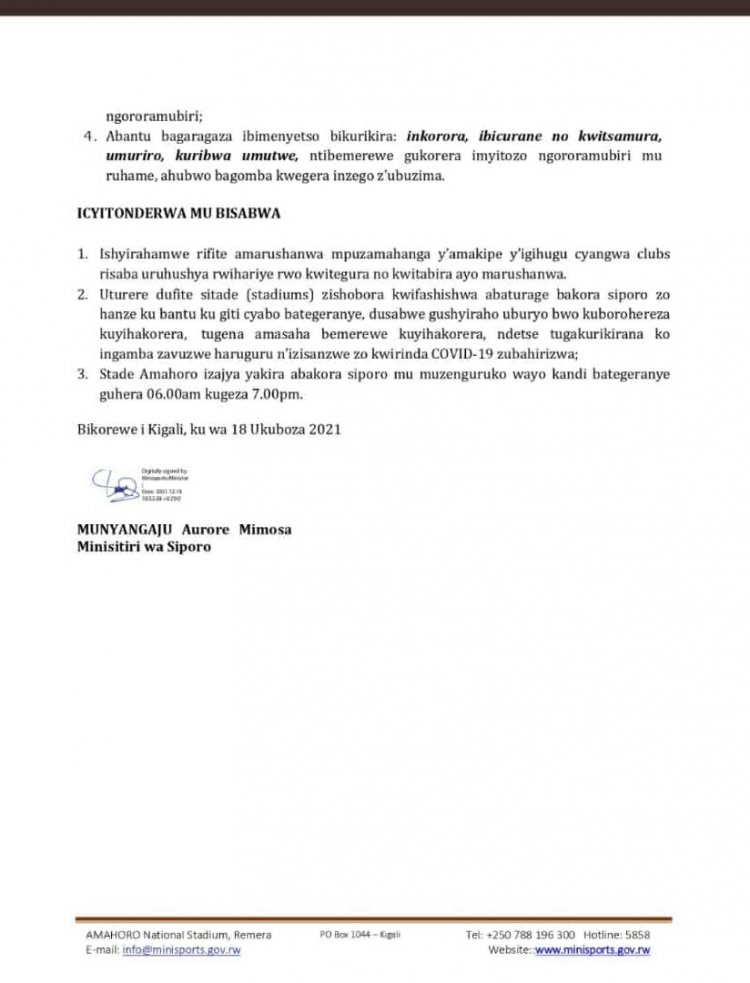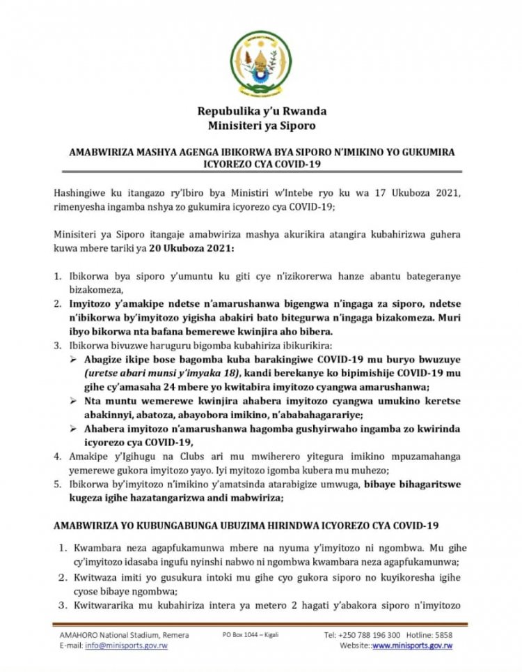 Nyuma y'uko ubwandu bwa coronavirus buri kwiyongera mu rwanda ntamufana wemerewe kwinjira ku kibuga ariko amakipe azakomeza gukina nkuko bisanzwe. bakazajya bakorera imyitozo ndetse numwiherero ahantu hamwe.